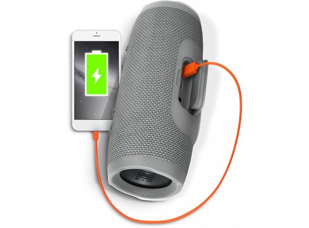 JBL Charge 3 представляет собой невероятно стильную, с интересным запоминающимся эргономичным дизайном, водонепроницаемую портативную акустическую систему. Она поддерживает беспроводную передачу данных и может быть сопряжена со множеством современных девайсов, поддерживающих технологию Bluetooth. Также колонка способна обеспечить необходимым зарядом любое совместимое устройство посредством разъема USB. Зарядка осуществляется даже тогда, когда JBL Charge 3 выключена.